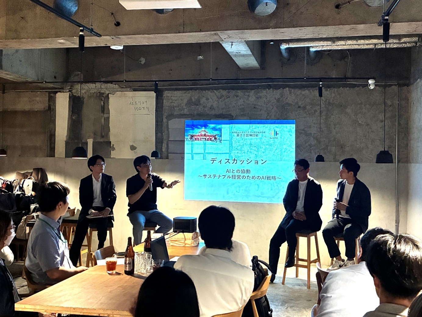 また、神田塾初の試みであるディスカッションパートでは、会員企業を代表して株式会社industria 代表取締役社長 高橋 一彰 氏と株式会社NTTデータグループ グループ経営企画統括本部 サステナビリティ経営推進本部 Sustainability Business Office 室長 山根 知樹 氏にもご登壇いただき、AI導入に当たっての試行錯誤や期待、AI自身が持つ課題について講師の遠藤氏と共にお話いただきました。